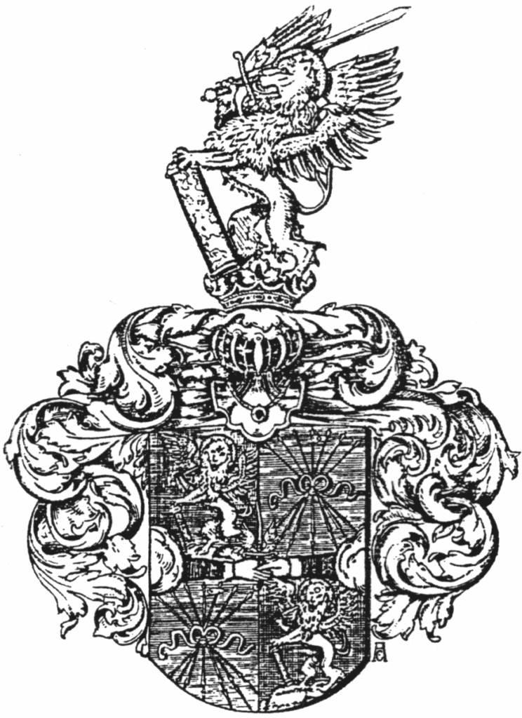 vorderen hinder sich auffwerts ein Schwerdt unnd auffm Schildt ein offener Helm, eine goltfarbe Cron, auff der Cron ein halber Löw mit Fliegelnn,