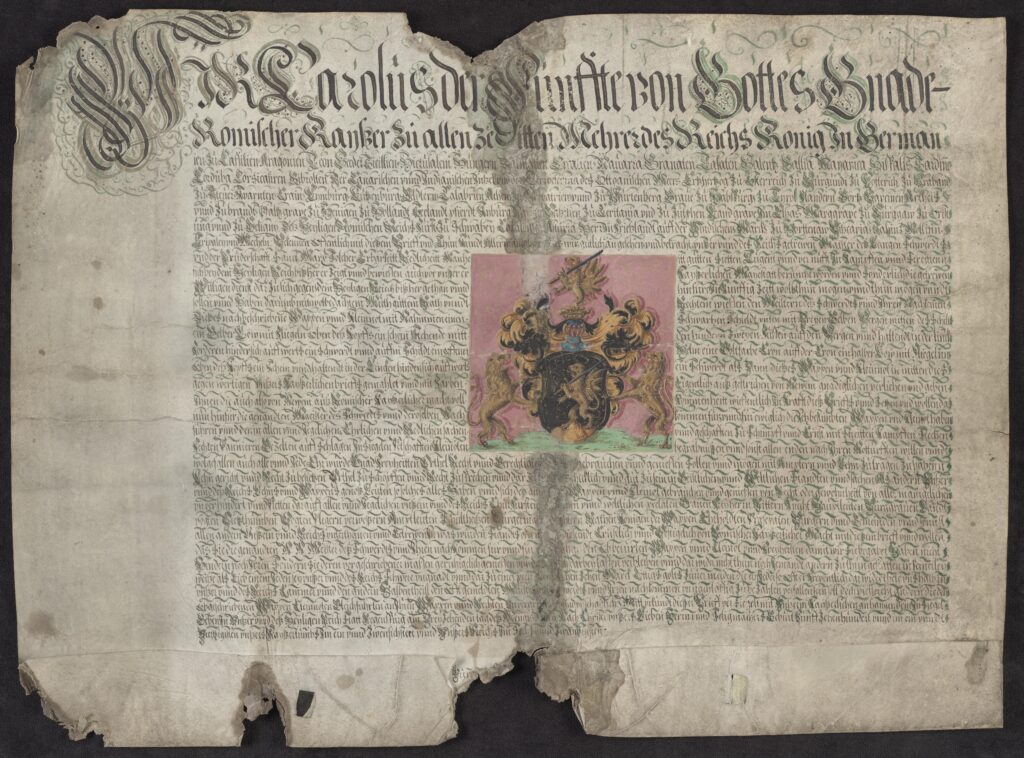 After yet another exhaustive search, I came across a curious document in the charter collection of the University of Gießen: a 1541 letter of privilege issued by Emperor Charles V in Regensburg to certain “Masters of the Sword”. Could this be the elusive privilege that first granted the Marxbrüder their coat of arms?