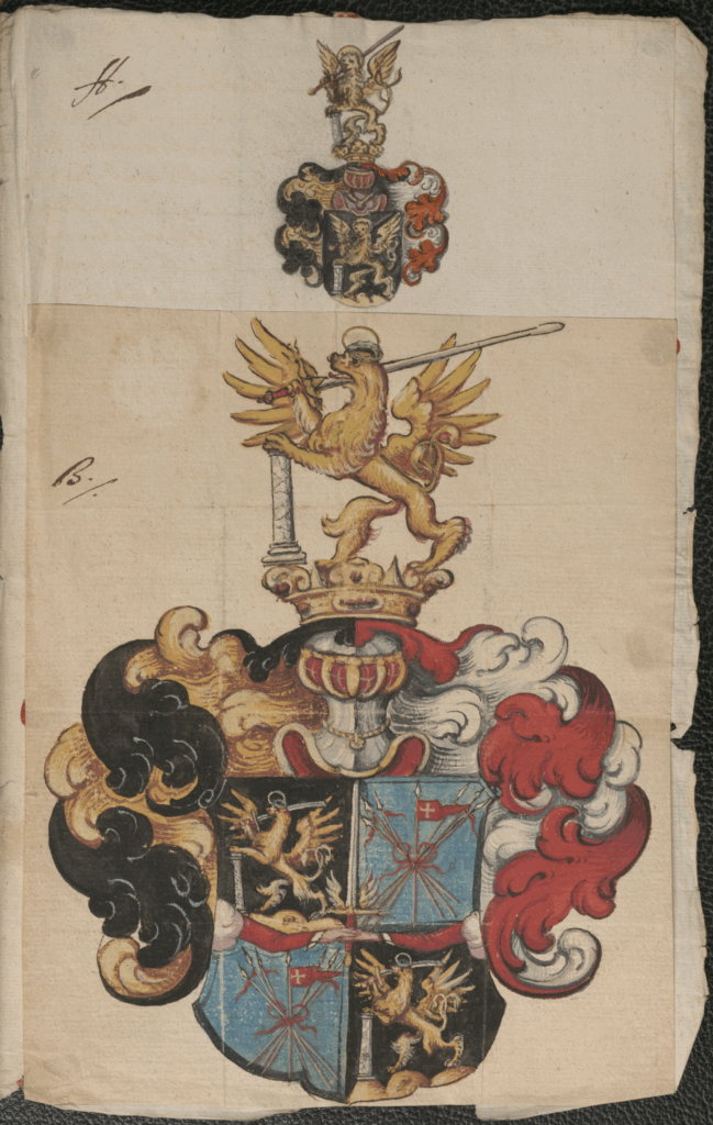In this case, I was extremely fortunate: a generous archivist at the HHStA confirmed that the Aulic Council had even preserved a concept of the charter – complete with both a blazon and colored depiction of the augmentation granted by Leopold I on 20 March 1670. Remarkably, this record has been stored in Vienna for over 350 years, where it still resides in a strikingly good condition. Although I had no signature to guide me, the archivist’s insight and responsiveness led me directly to the arms, nestled within a rich convolute of newly uncovered Marxbrüder records.
