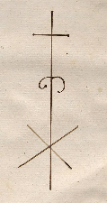 The second and third field17 is sky-blue mixed with ruby.18 Therein appear six jousting lances arranged crosswise with their points upward, three to the right and three to the left. At their center stands an upright pike19 bearing a tapered blood-red pennon marked with a golden cross. All are held together in the middle with a red band whose ends fly downward.