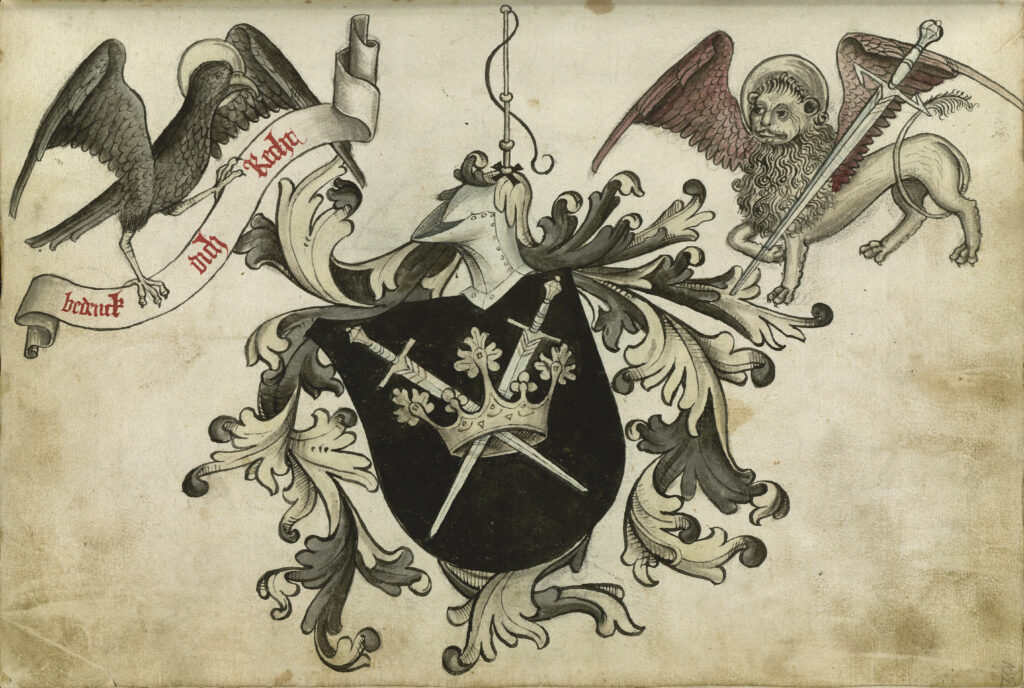 - H.18.03 Nr. 32., fol. 6r. In the Holy Roman Empire, these three words were the “magic formula” for an armorial augmentation (“Wappenbesserung”). ↩︎