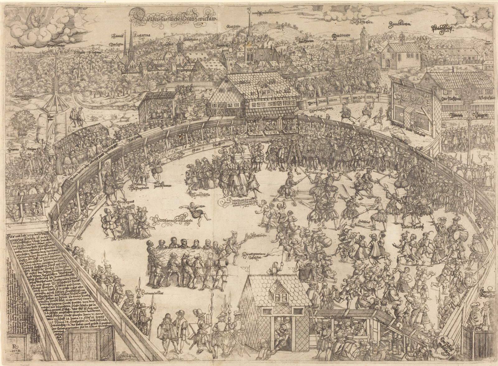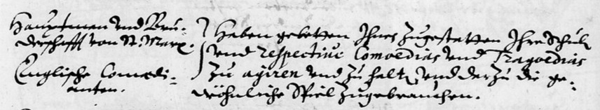 A 17th century poetic description of the trade fairs likewise refers in passing to a Fechtschule at the Krachbein, followed by a comedic theatre.74 By that that time, the inn was not a mere drinking house but a large, lively entertainment venue. It possessed a spacious dance hall75 with a substantial stage (attested already around the Thirty Years’ War 1628–1648) which regularly hosted English comedy troops76 and dance events. Such a setting was ideal for Fechtschulen, which required ample room for numerous fencers wielding weapons such as long swords and polearms as well as space for musicians, and an assembled audience. As with performances at the Globe Theater, specators likely would have eaten and drunk – perhaps Bamberg beer mentioned in this context,77 or Rhenish wine.