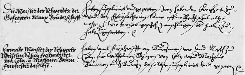 Seind in Ostermeß 1674 von Johannn Beckern, an statt Martin Kähls als ieziger Zeit Hauptmannen der brüderschafft von St. Marx, zu Meistern des langen Schwerdts geschlagen, approbirt und zu gelassen worden.